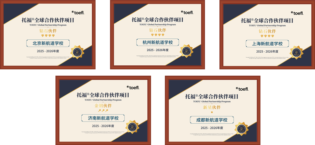 作为托福官方长期合作伙伴,新航道连续六年获授最高荣誉的合作伙伴奖(2020-2024:“托福联盟项目三星级成员”;2025:“托福全球合作伙伴项目钻石伙伴”)。